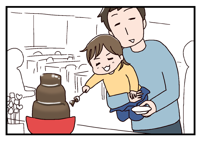 デザート系もアイス、ケーキ、フルーツなどたくさん。チョコレートファウンテンもありました。ふだん控えさせられているチョコが食べられて、マイちゃん大満足。