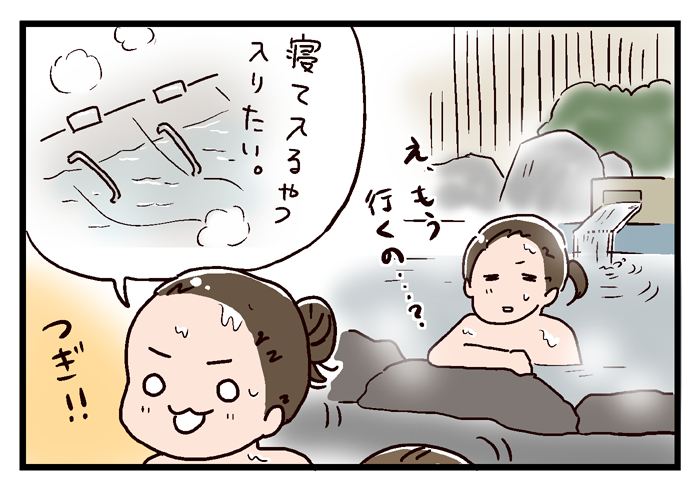 小さい時からずっとこうなんだよね…。メイ子について全部の風呂にちょっとずつ、を2周。そのうち子どもだけ温まってきて出ることに。