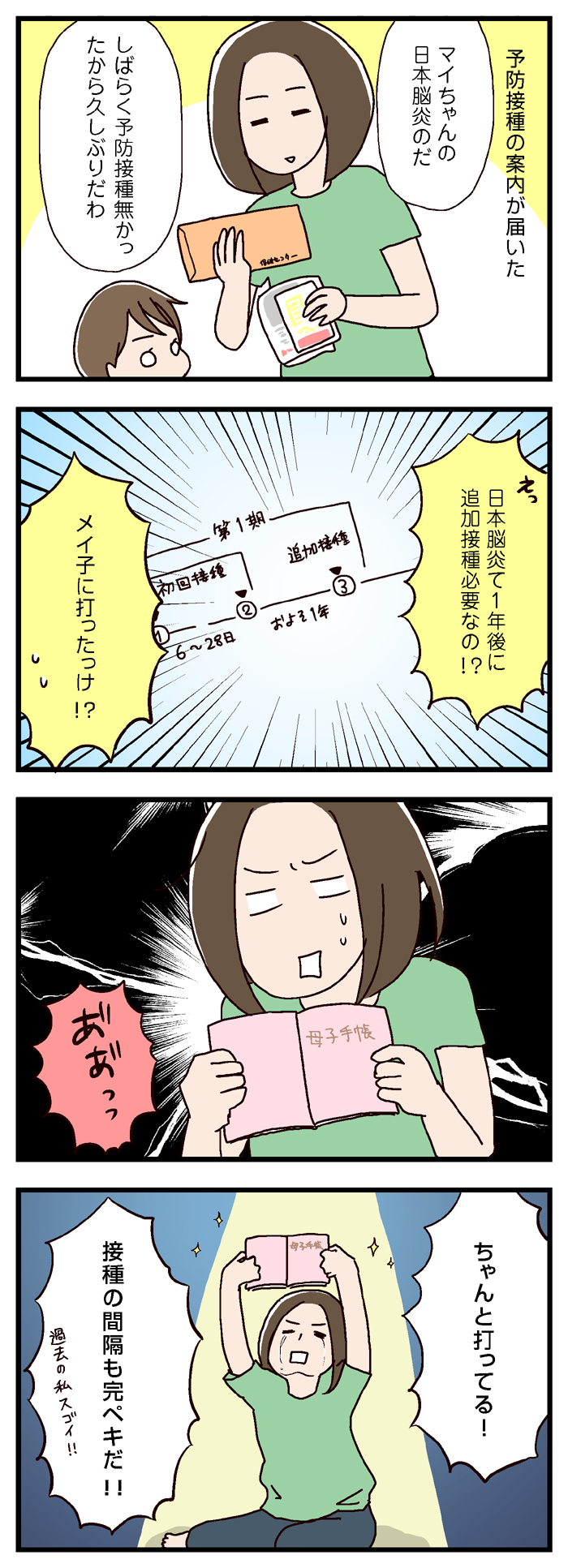 自分の仕事のスケジュール、メイ子の小学校の予定、習い事、マイちゃんの保育園のことなどなど…。あ、あとダンナの出張の日とかも。家族みんなの予定を覚えて食材の調整をしたり、習い事の振り替えをしたりと毎日忙しくて、ここしばらく予定の無かった予防接種についての記憶がすっぽり抜け落ちてました。