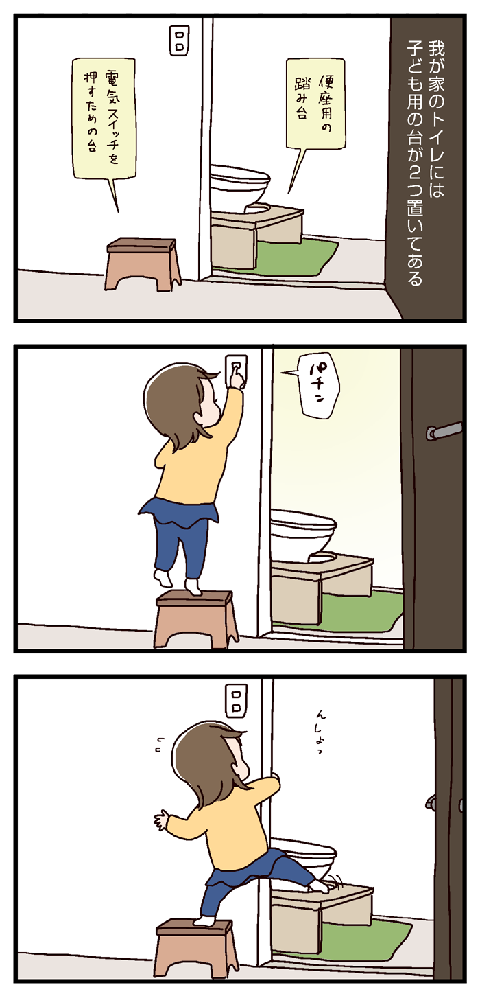 トイレの電気、うちは人感センサーの電球に変えてスイッチいらずでずいぶん楽になりましたよ。ドアを開けたらパッ!と点灯です。小さいお子さんがいる家庭にオススメです(^^)