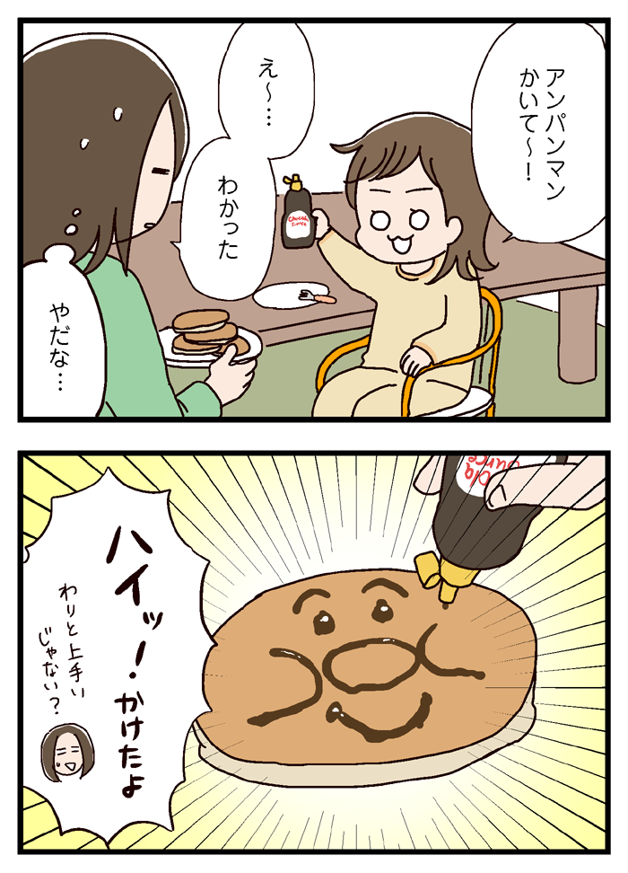 マイちゃんはいつも、チョコソースでアンパンマンを描いて!とリクエストしてくるのですが…。