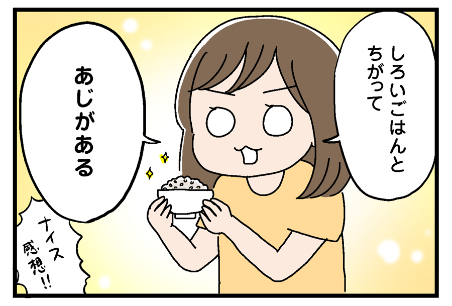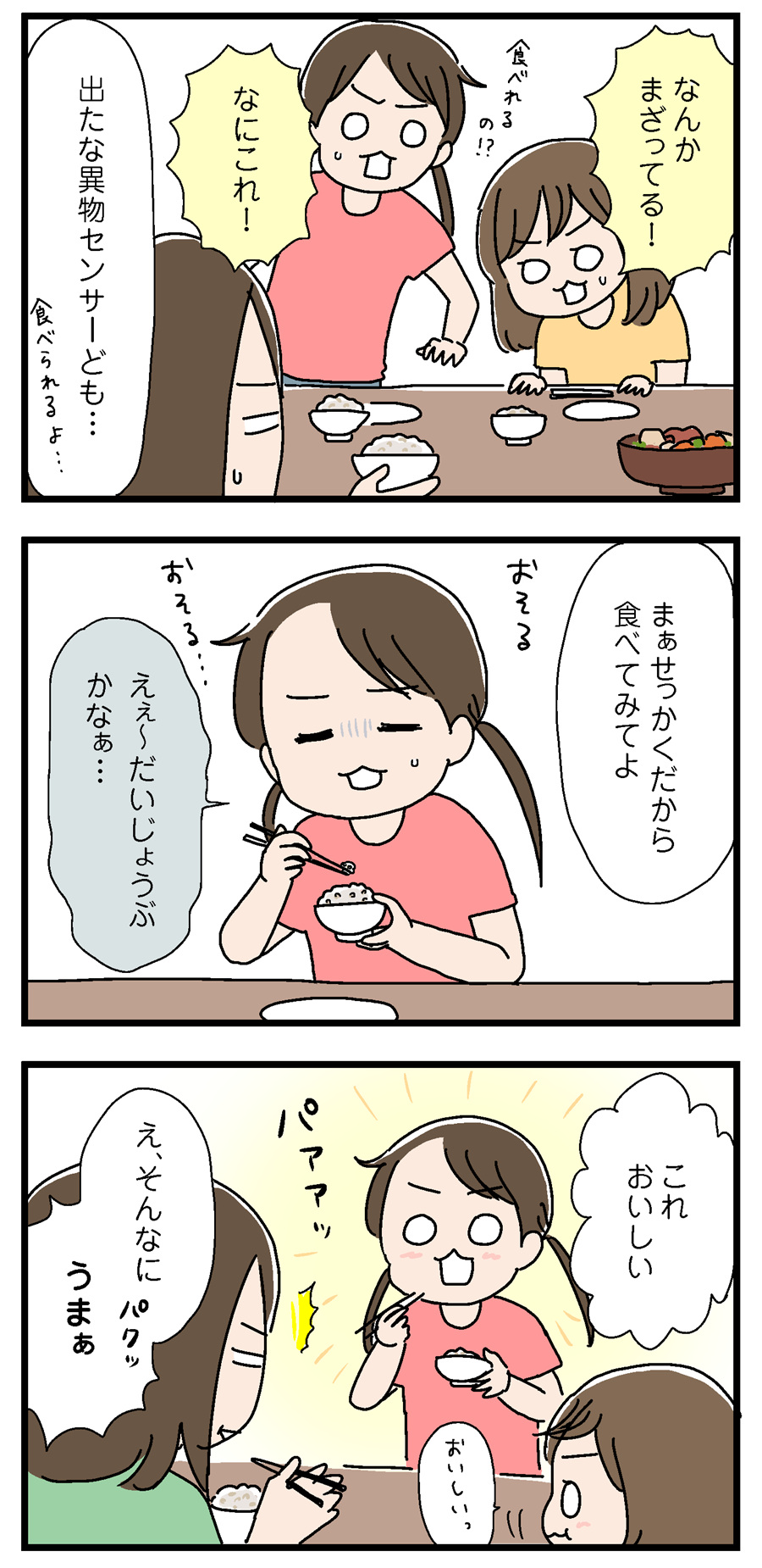 子どもたちは雑穀米とかお赤飯とか、何か混ざってるごはんをあまり好まないので心配だったのですが…。やはり最初は警戒していました(笑)