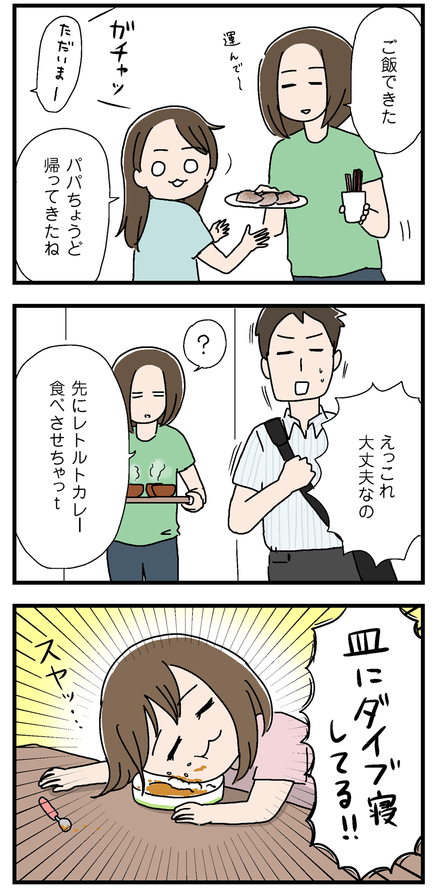 もう5歳なんで食べてる最中は寝ないだろうと油断していました。これ正面から突っ込んだら窒息するよね?子どもって呼吸<睡魔なのかな…怖えな(((( ;゚д゚)))