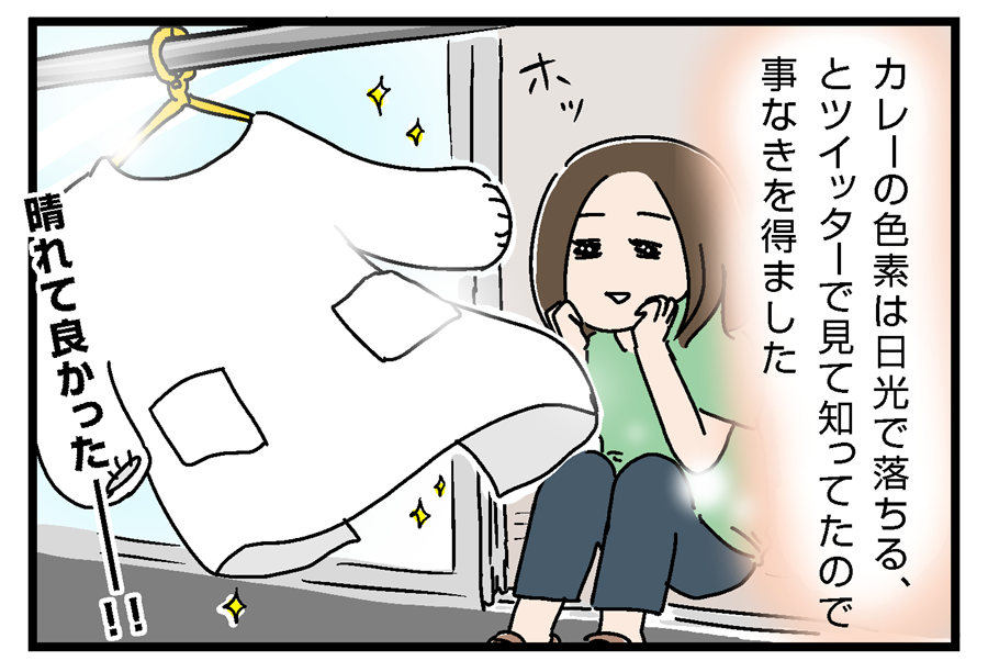 (割愛しますが)いろいろがんばったけど、洗濯して干す瞬間まで黄色いのが残ってたので絶望してたんです。でも取り込む時にはシミが消えてて驚いたんですよね!めちゃくちゃいい天気だったので、アレもこういうことだったんですね!謎が解けた。笑