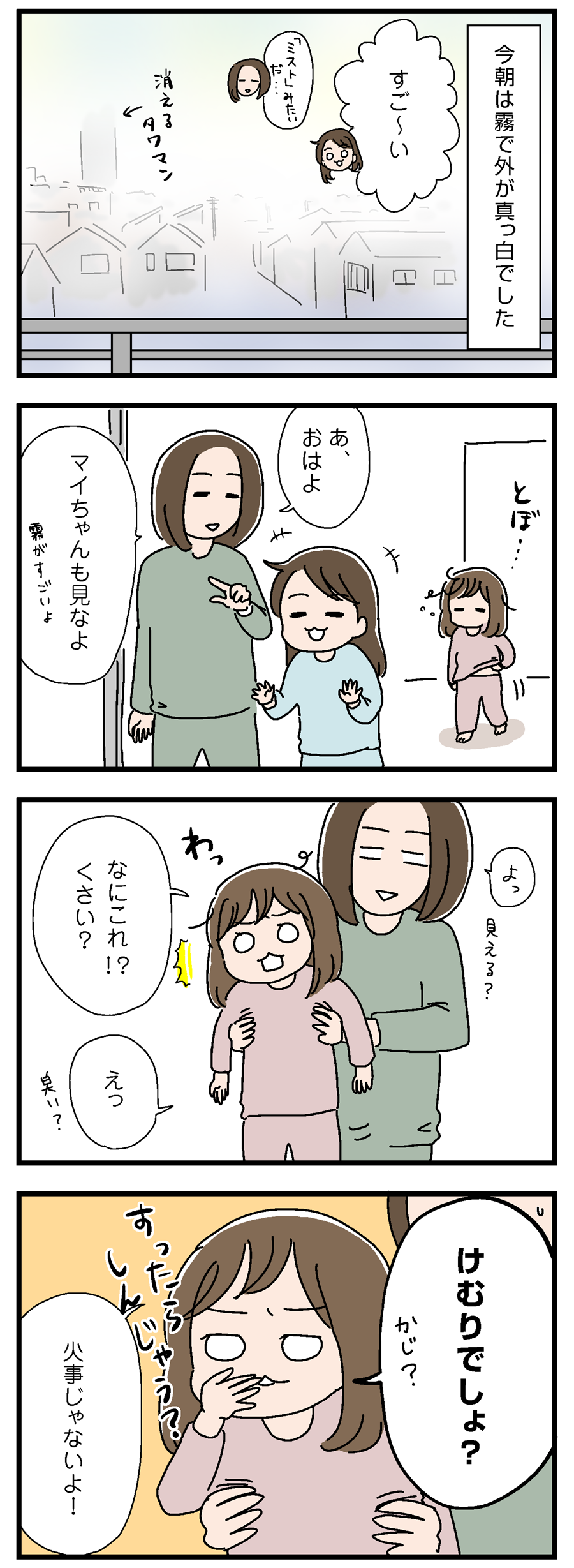 霧は初めてだけど火事は見たことある(遠目にだけど)都会っ子…。煙への警戒は避難訓練の賜物だと思われます。
