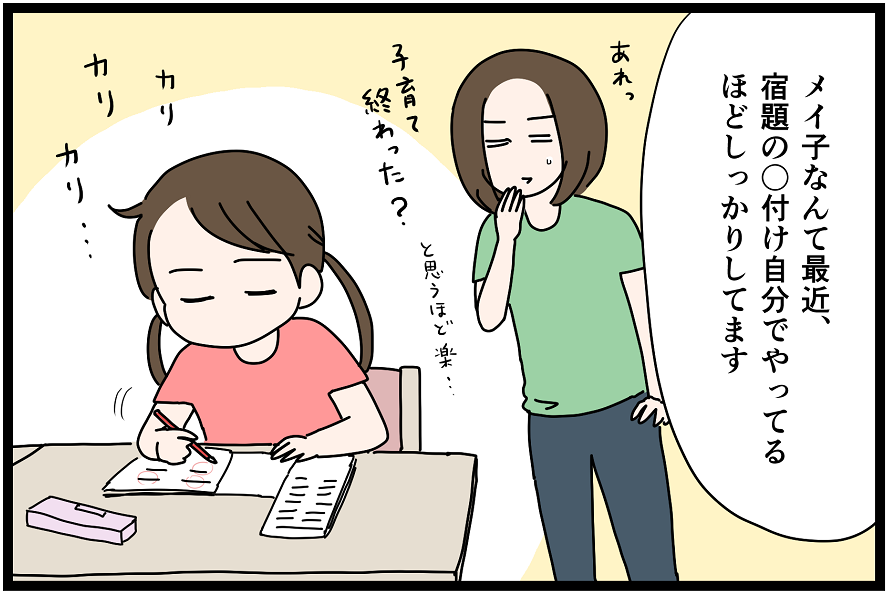 学校再開してから自分で丸付けしてくれるようになりました。毎晩、自分の自由時間前の最後のひと手間だった丸付け。これが無いだけでかなりラクです。