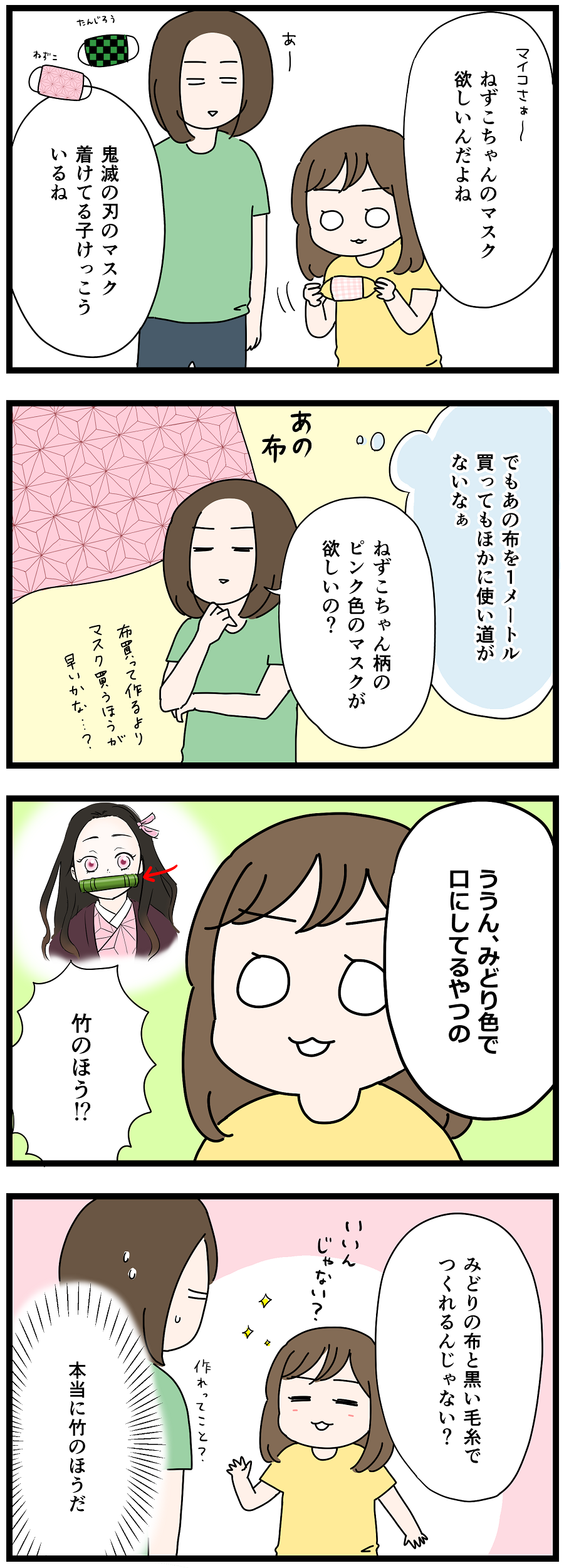 「禰豆子ちゃんのマスクが欲しい」と言い出したマイちゃん。