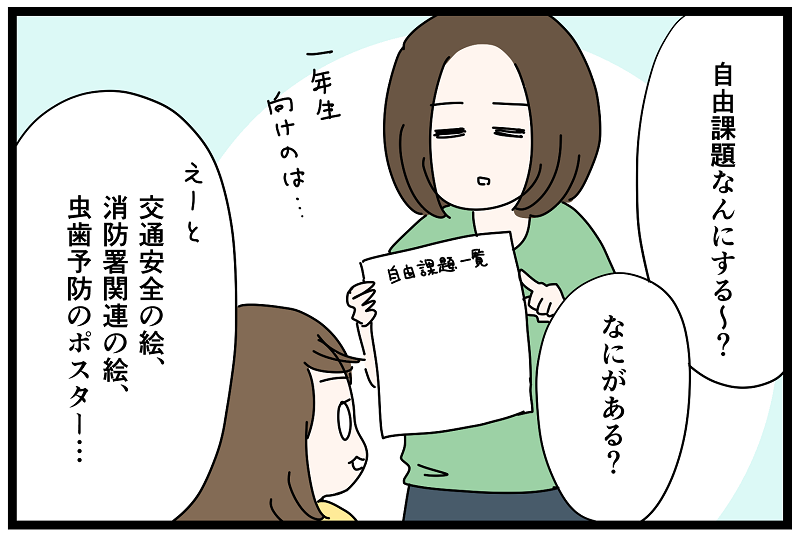 自由課題。ポスターなど絵を描くだけで終わりのものも1個やればOKという、自由研究よりはラクな内容なんだけど。一年生はまだ何やるかわかってない感じなので、説明から始めた。