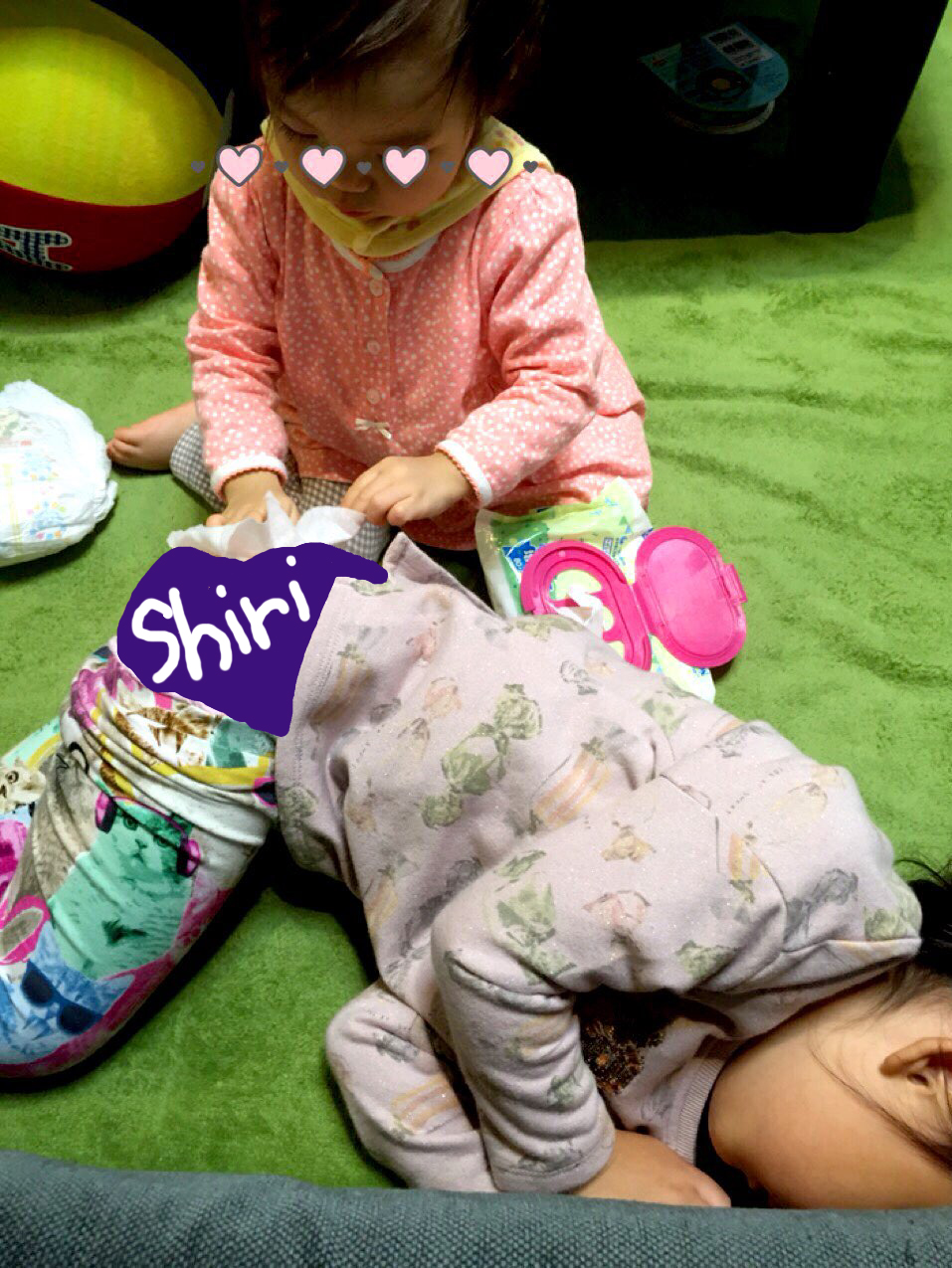 マイちゃん、おむつ替えが面白いらしくて。保育園に入る前からうたた寝するメイ子にやってみたり